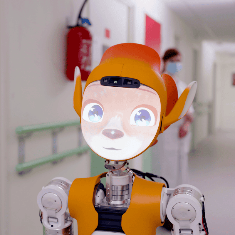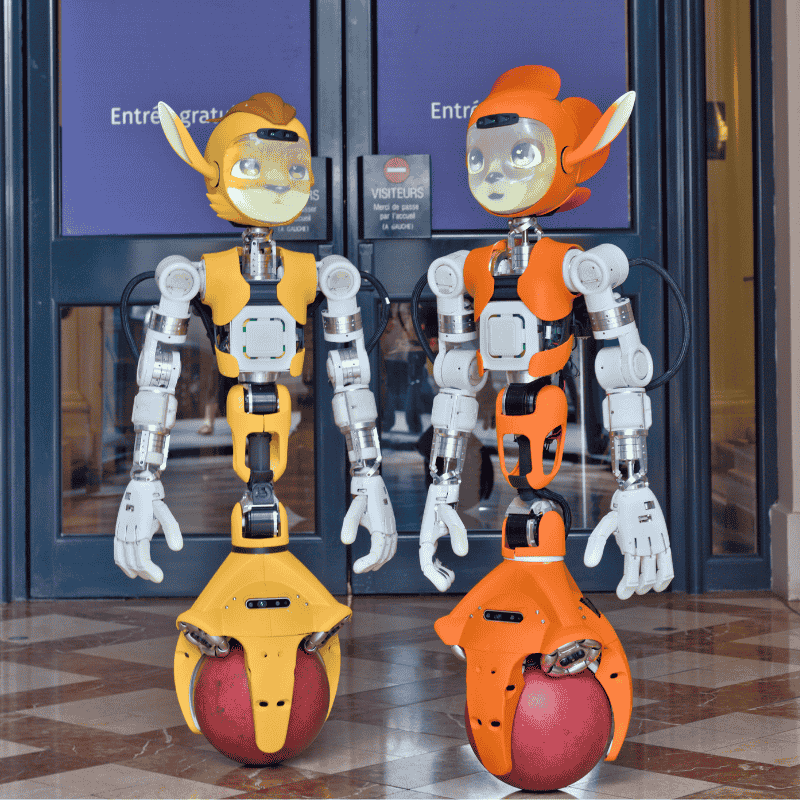 Doté d’un visage animé expressif, d’une voix multilingue et d’une mobilité sphérique fluide, il évolue avec grâce dans les espaces publics et professionnels : salons, aéroports, hôtels, conférences…