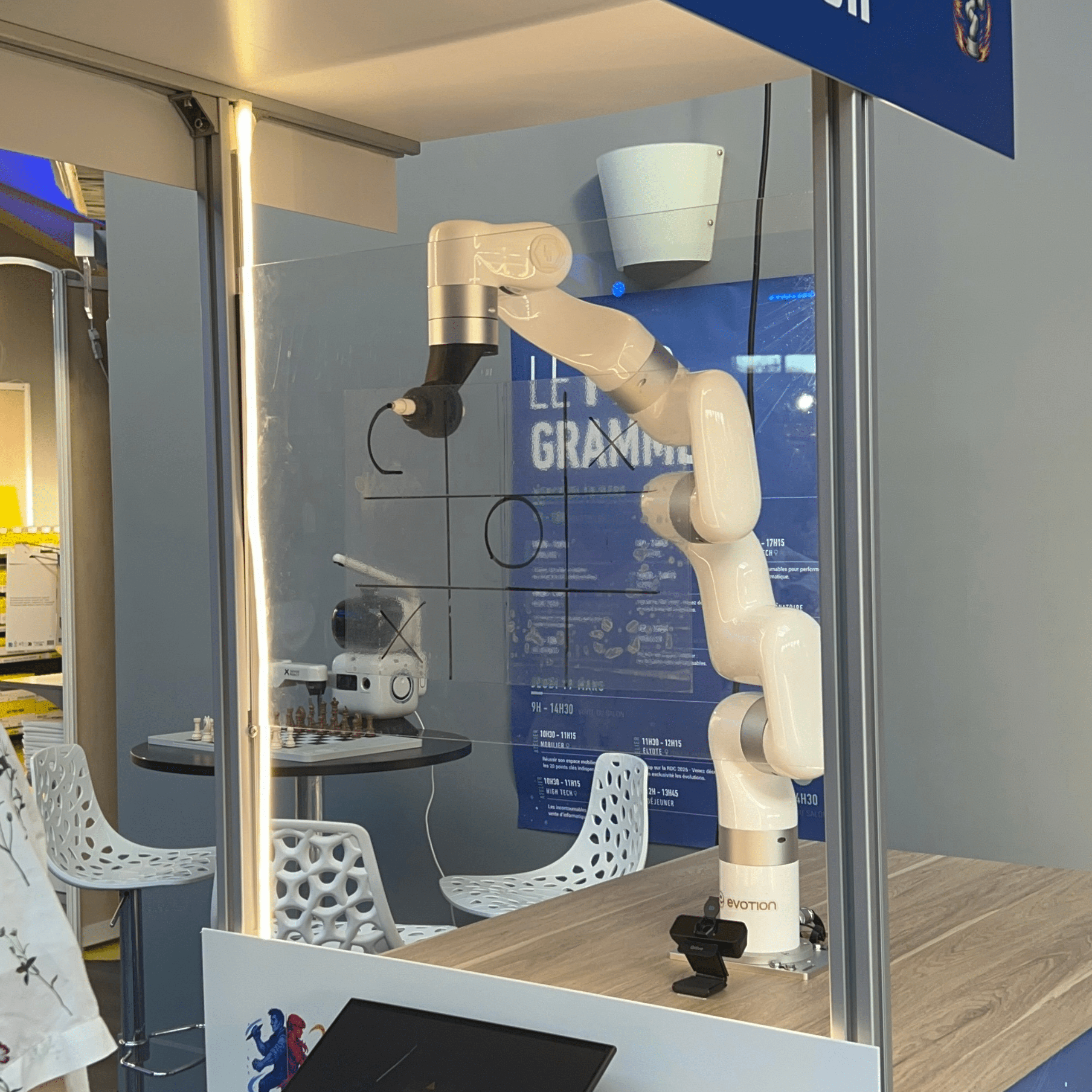 Proposez une expérience originale et engageante avec le Robot Morpion : un bras robotisé capable de jouer seul contre vos visiteurs en temps réel.